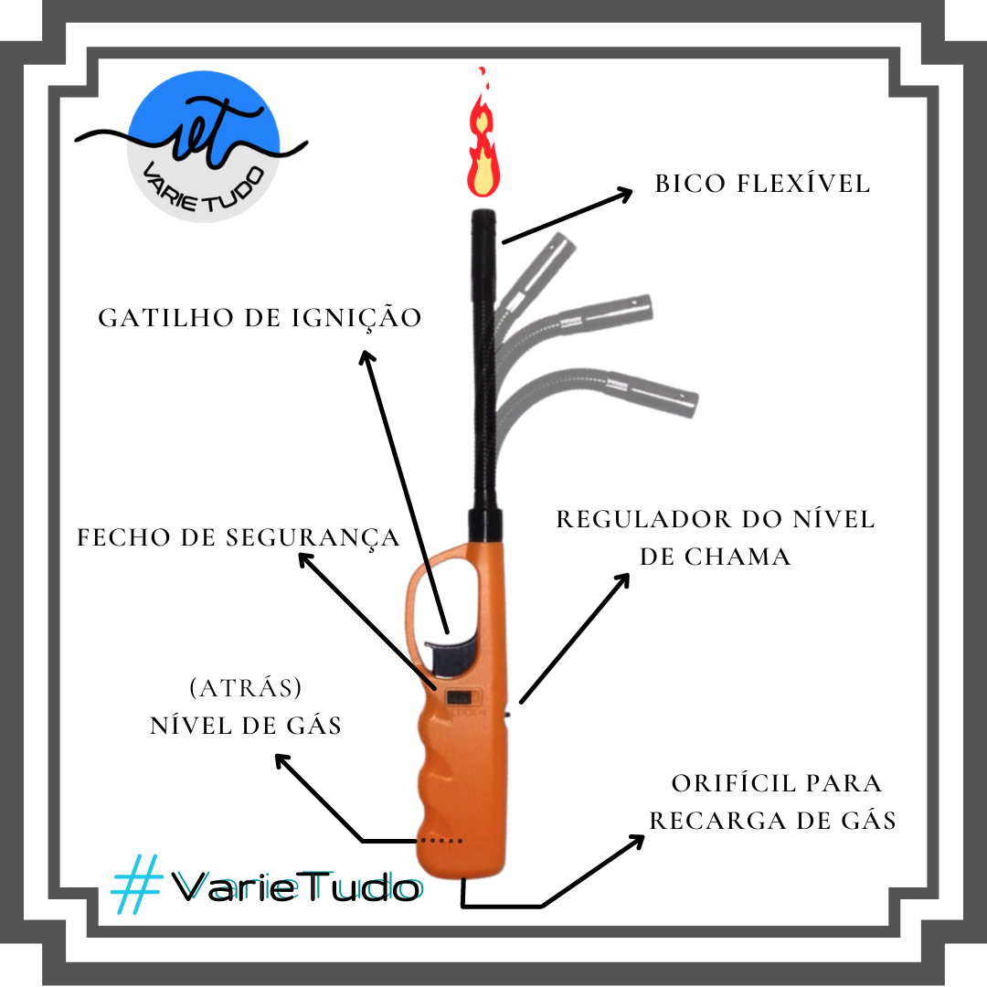 O acendedor multiuso recarregável a gás com o bico flexível tem um design diferenciado e moderno que favorece o manuseio. Além de ter um índice de segurança altíssimo, pois tem trava de segurança e regulador de chamas é, muito resistente e grande durabilidade.