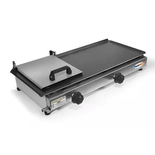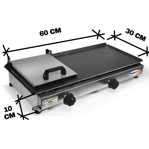 A Chapa 60×30, tem sua estrutura confeccionada em chapa de aço minimizado, painel frontal em aço Inox aço inox 430 escovado, possui sua chapa superior para frituras em aço carbono, indicada para o uso doméstico ou pequeno comércio. Com 02 queimadores que são bem distribuídos para melhor aquecimento da chapa. O sistema de acendimento é manual com gaveta, gerando maior segurança para o consumidor. Contém gaveta aparadora de resíduos, que facilita na hora da higienização, com ajustador de temperatura, possuindo 5 posições de intensidade das chamas. Sua prensa é de fácil manuseio e garante rápida e perfeita finalização dos lanches.