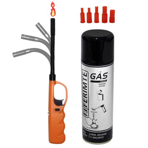 O kit vem com 1(um) acendedor bico móvel recarregável a gás (sortido) e com 1(um) cartucho de gás butano. O kit foi criado para facilitar o uso continuo do acendedor, pois como ele é recarregável, quando o reservatório do acendedor estiver acabando, basta abastecer com o cartucho de gás.