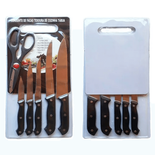 Para quem busca praticidade na cozinha, o conjunto de facas, tesoura e tábua é a escolha perfeita. Com 5 opções de facas para qualquer corte, esse conjunto trará agilidade no preparo de qualquer receita. Esse kit contém 7 itens: 1 tesoura 21 x 7,5 cm, 1 faca para carne 31,5 x 3,5 cm, 1 faca para descascar 30 x 3 cm, 1 faca para desossar 25 x 2 cm, 1 faca para legumes 23 x 2 cm, 1 faca utility 19 x 2 cm e 1 Tábua 25 x 17,5 cm.